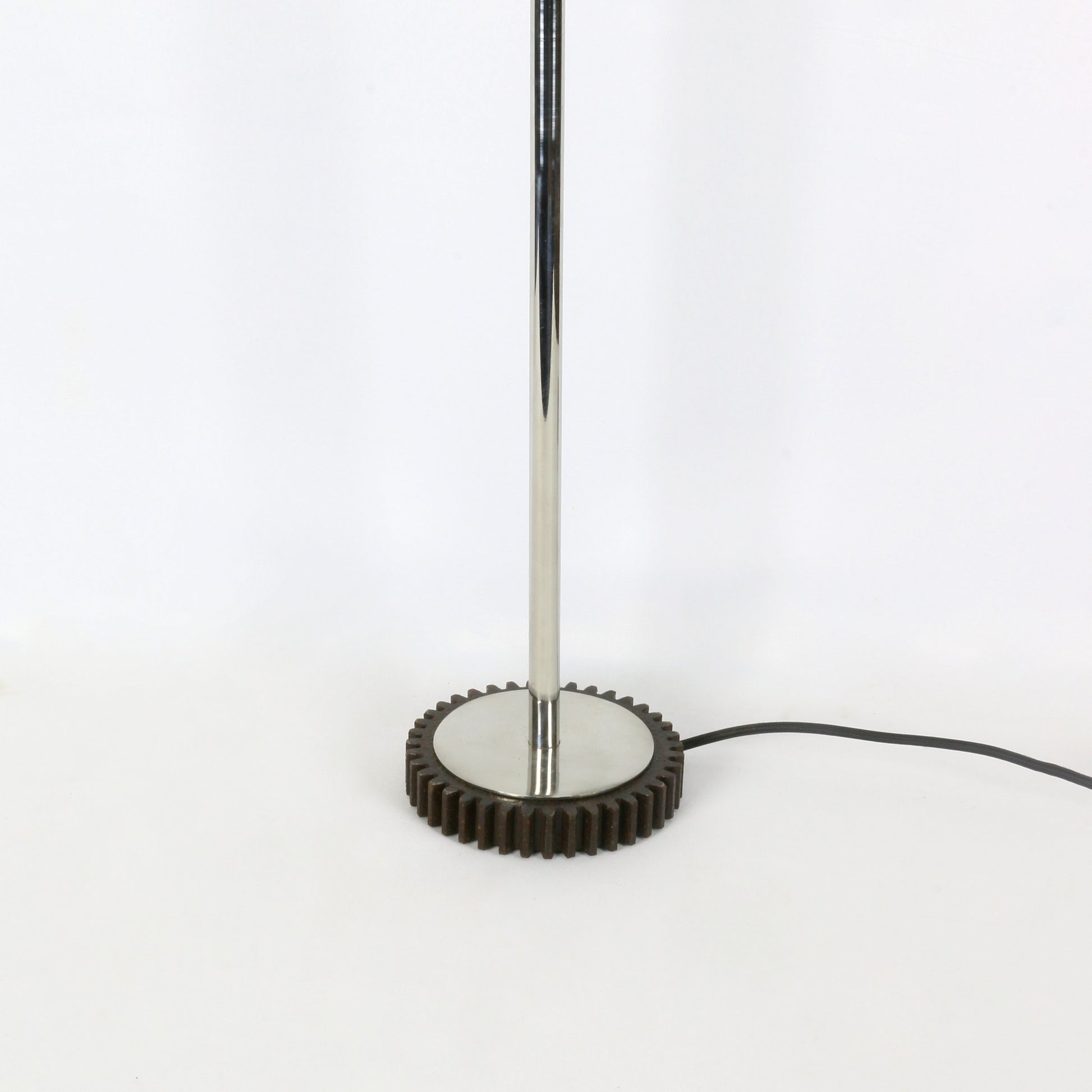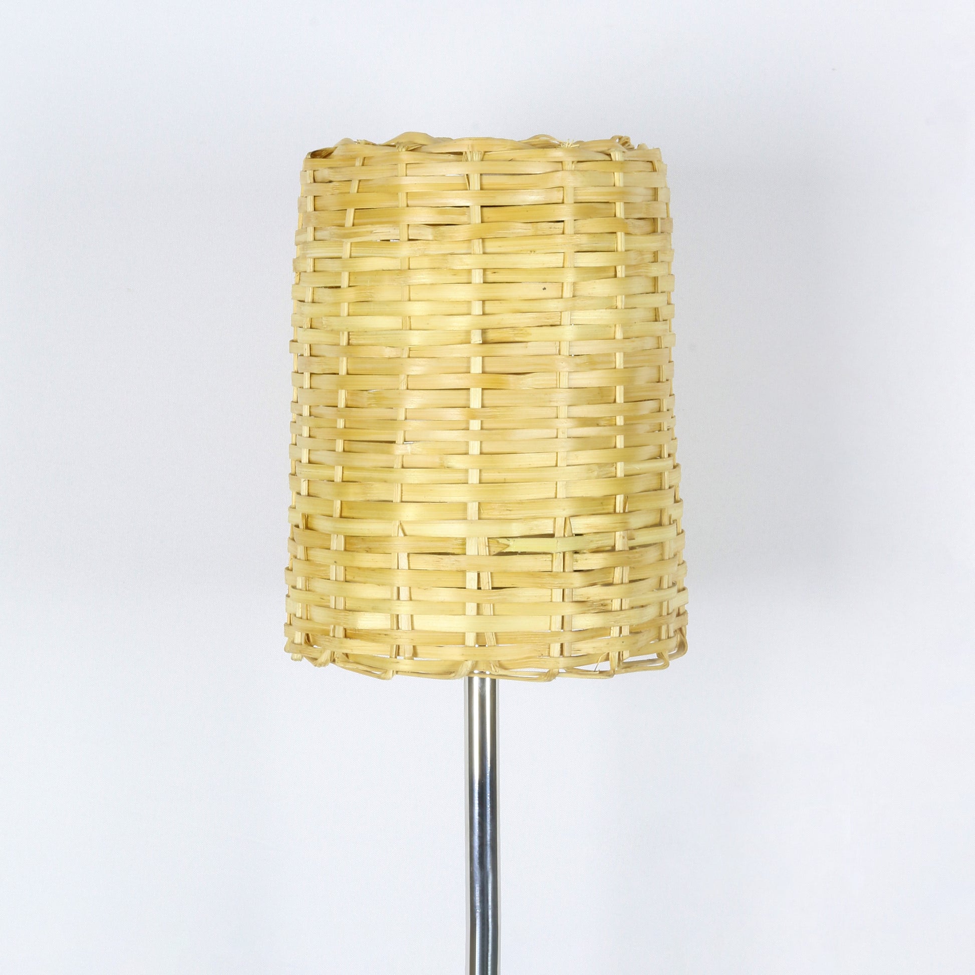 Luminária para ser usada em mesa, com estrutura em inox e sucata em ferro, com cúpula em cesto de palha, produzido por artesãos do Recôncavo baiano.