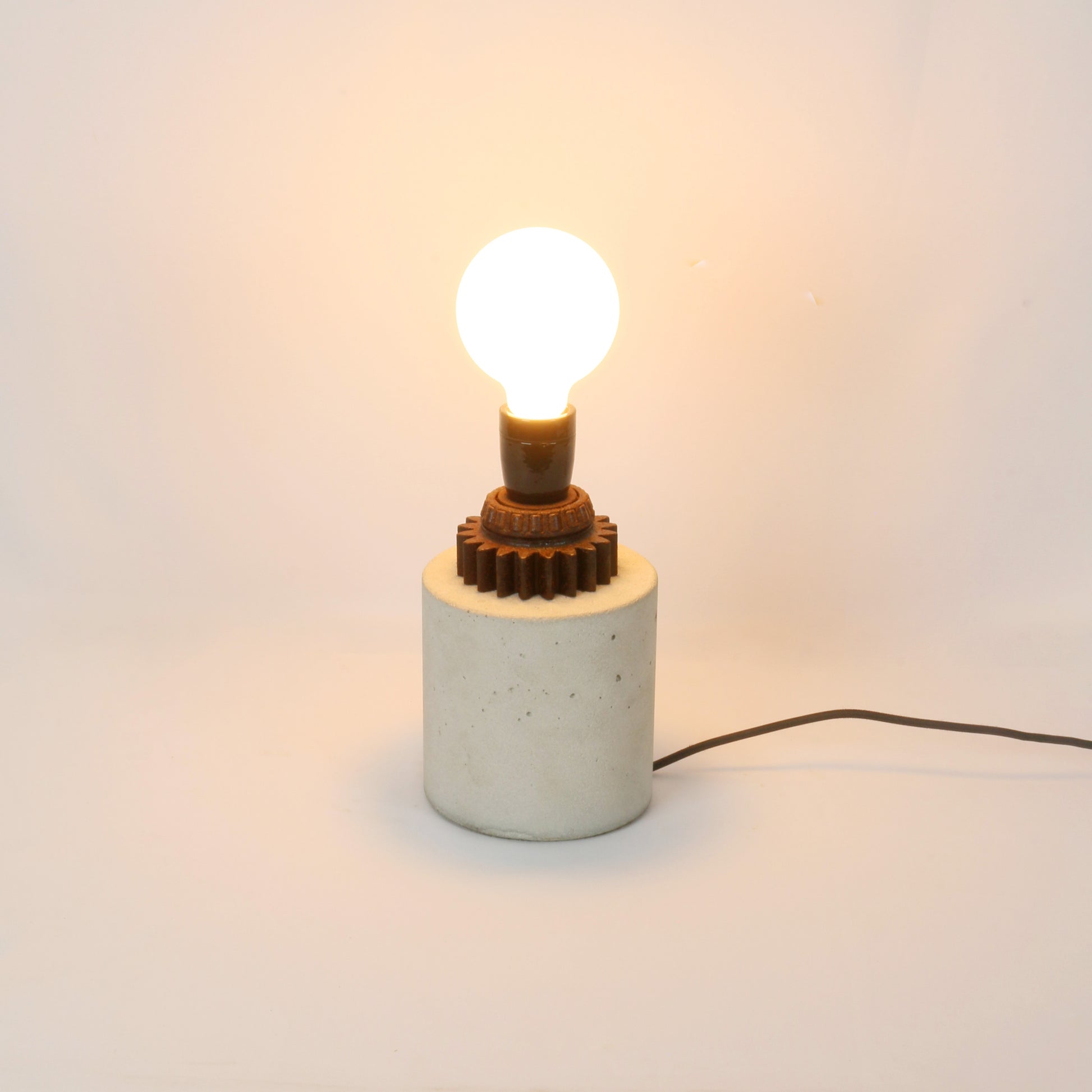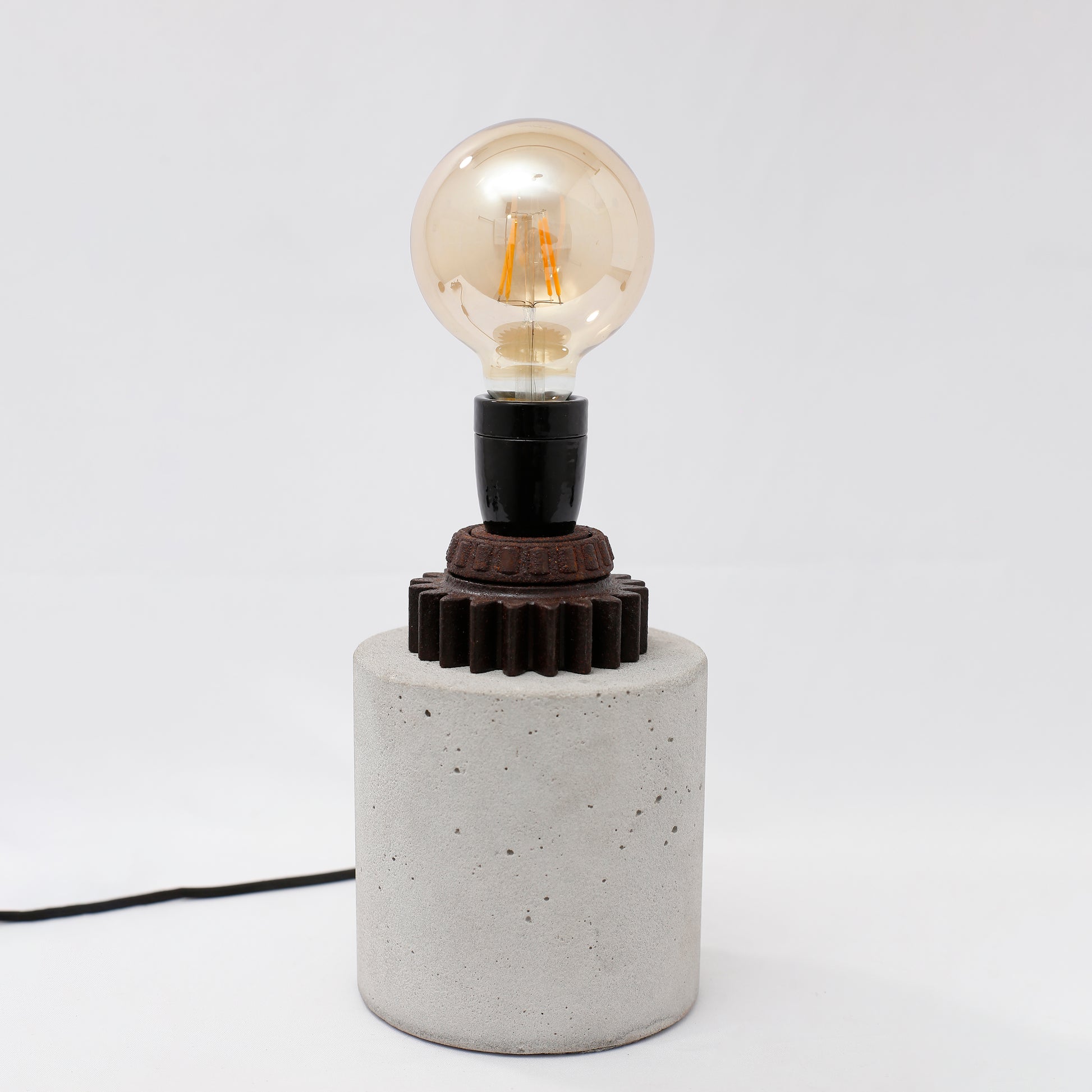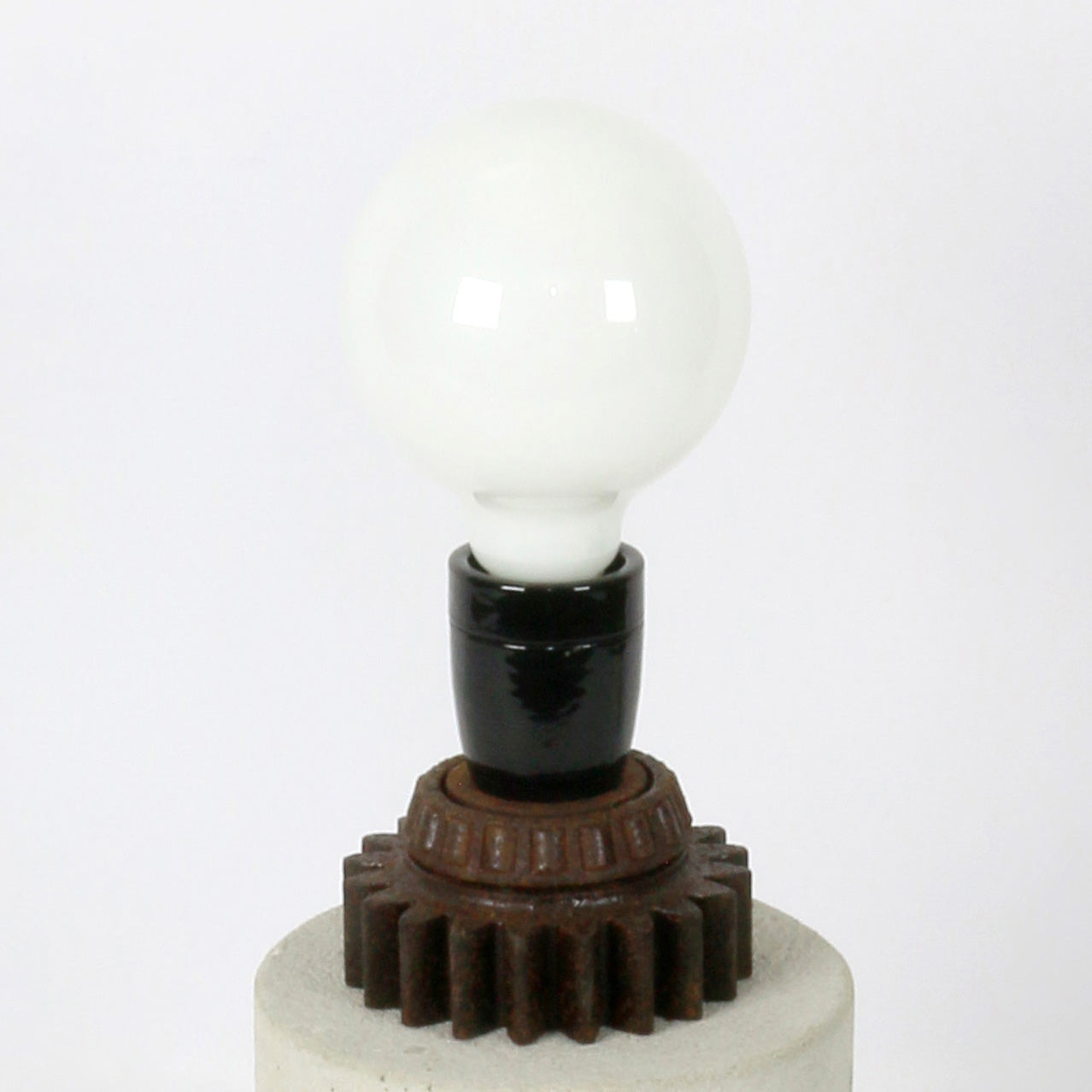 Luminária para ser usada em mesa, com estrutura em concreto, sucata oxidada e bocal de louça preta E27, o qual adapta a maioria das lâmpadas até 100v.