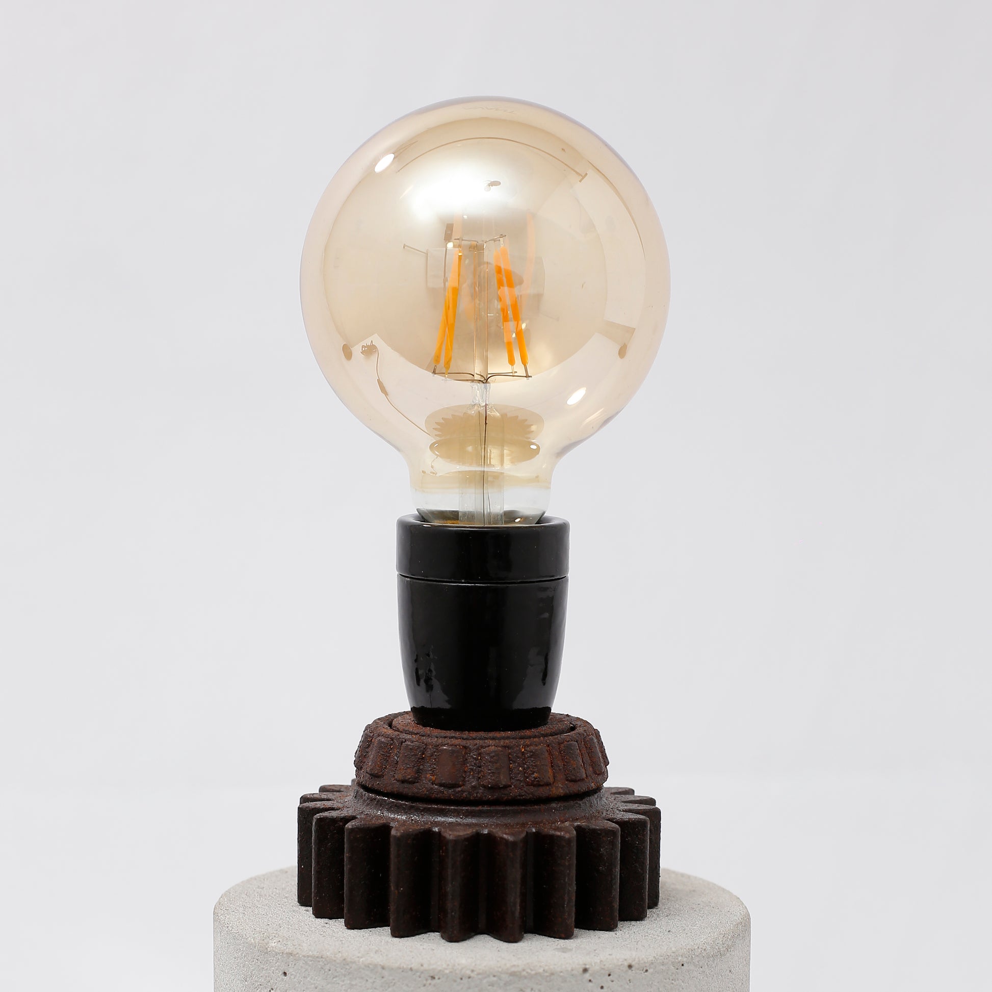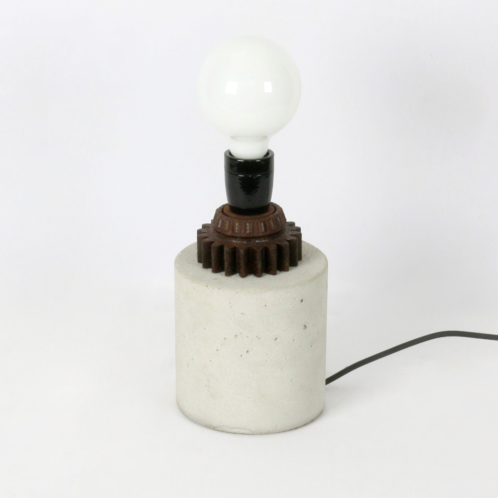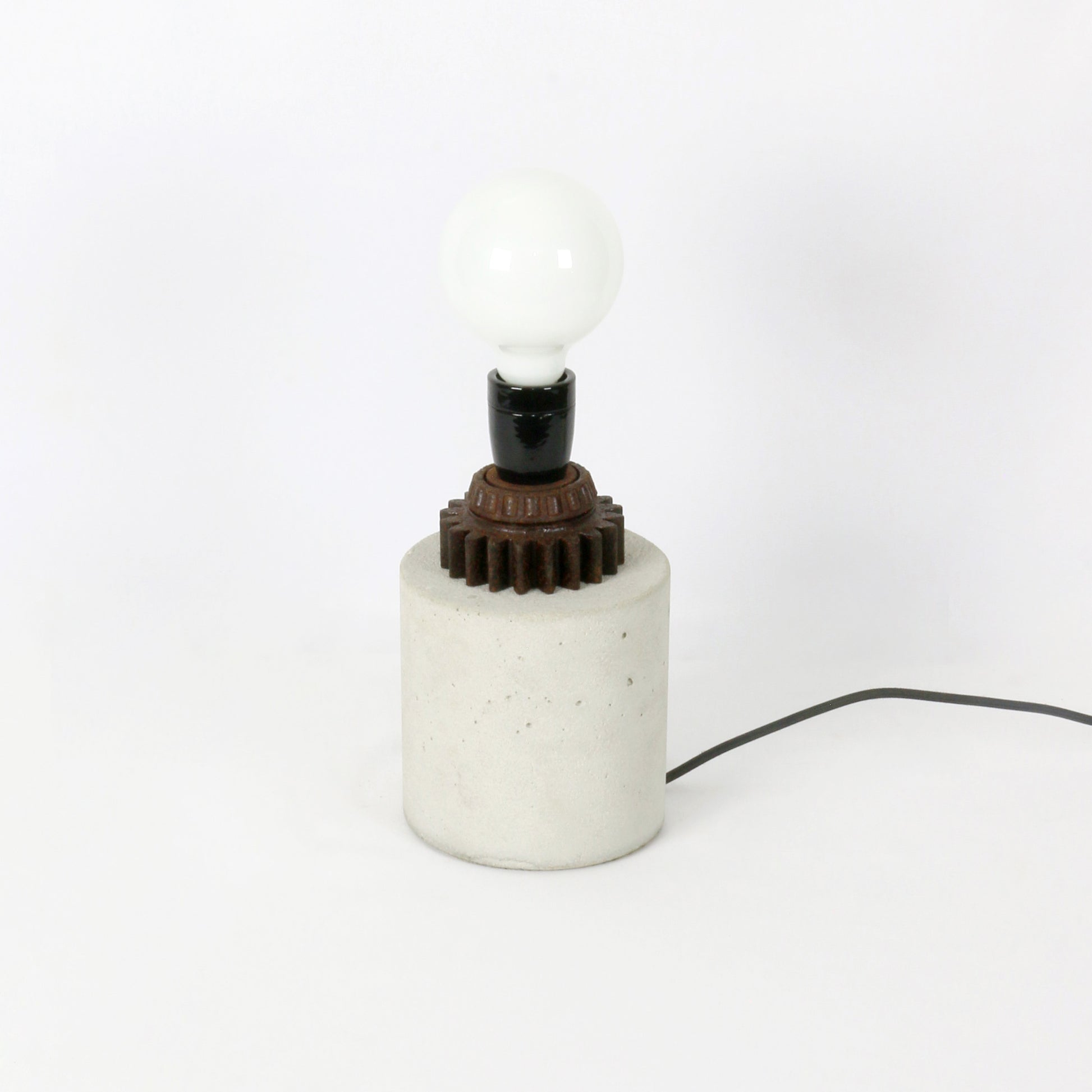 Luminária para ser usada em mesa, com estrutura em concreto, sucata oxidada e bocal de louça preta E27, o qual adapta a maioria das lâmpadas até 100v.