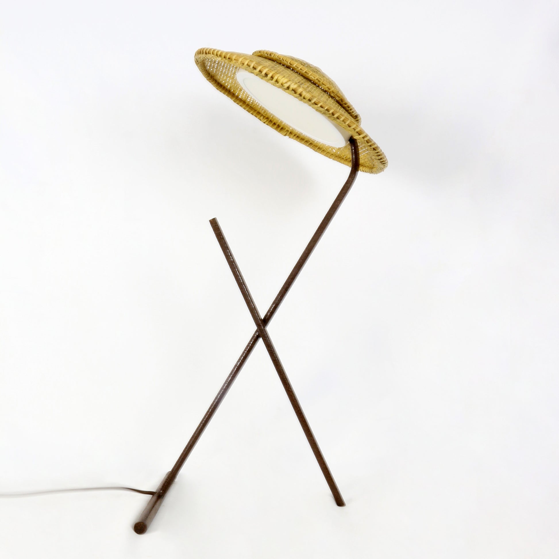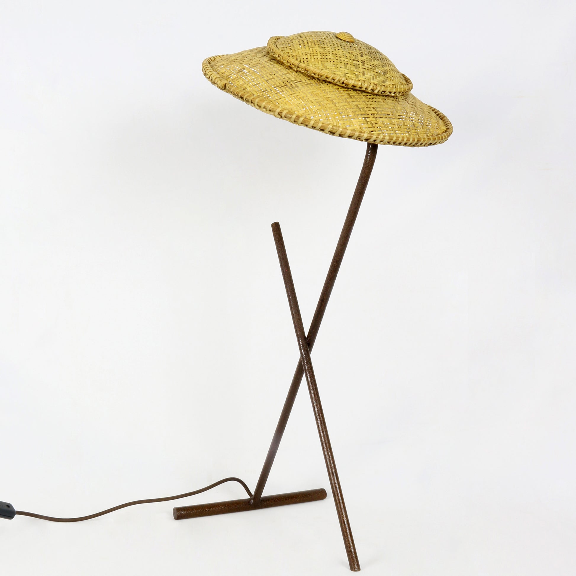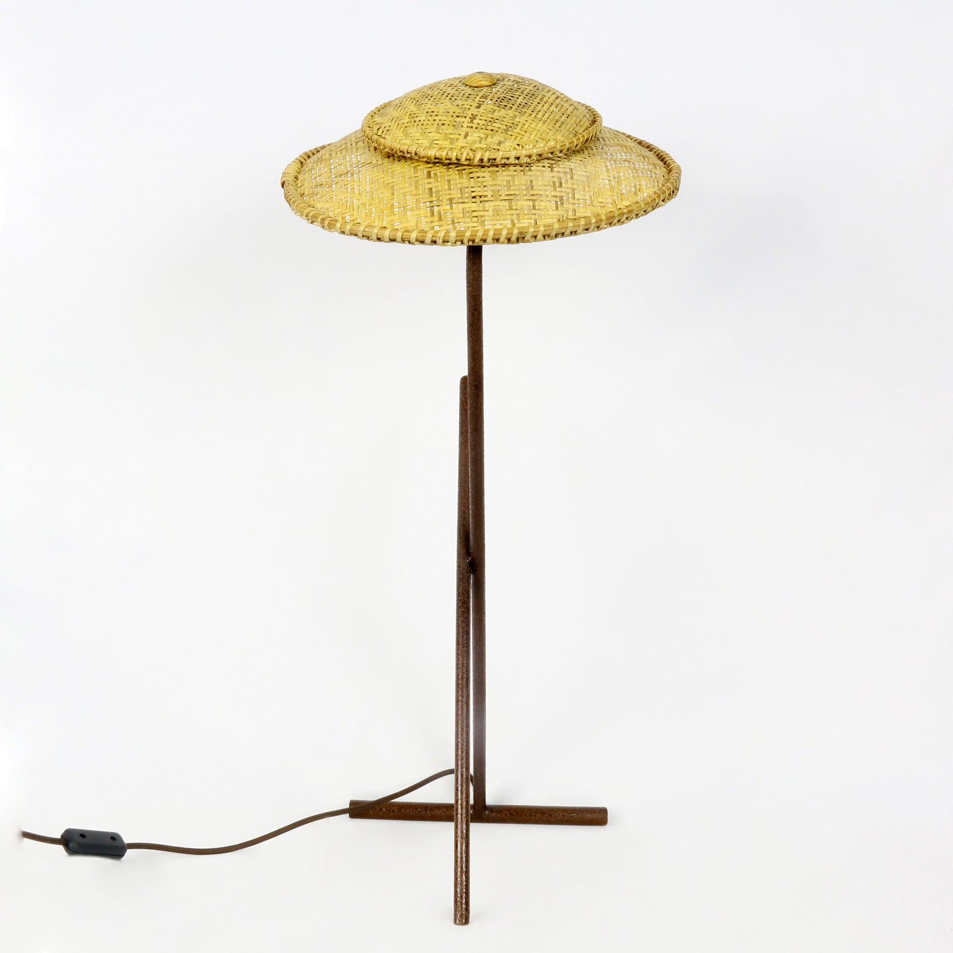 Luminária para ser usada em mesa, com estrutura em ferro oxidado e cúpula de peneiras.