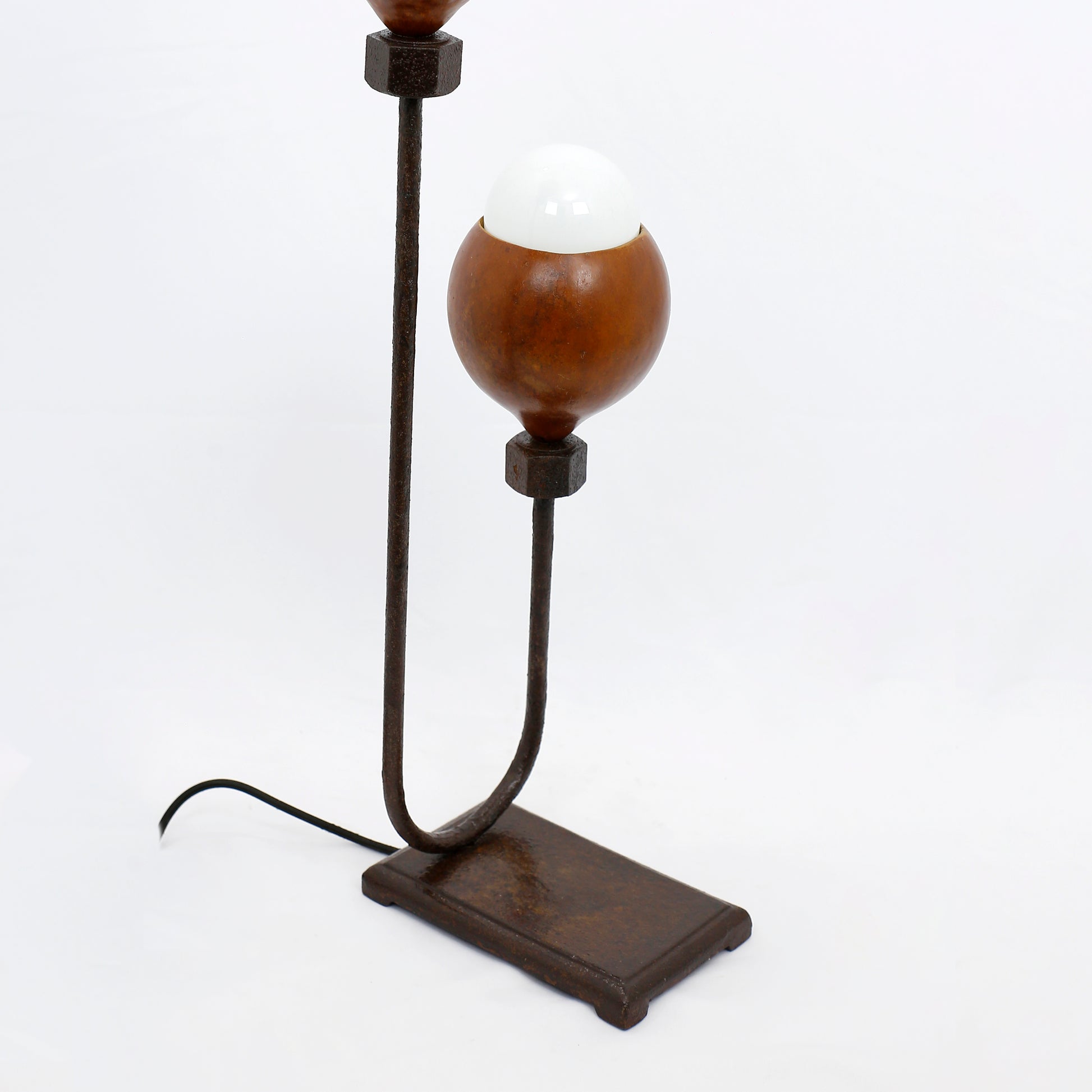 Luminária para ser usada em mesa com estrutura em sucata oxidada e cúpulas em cabaças.