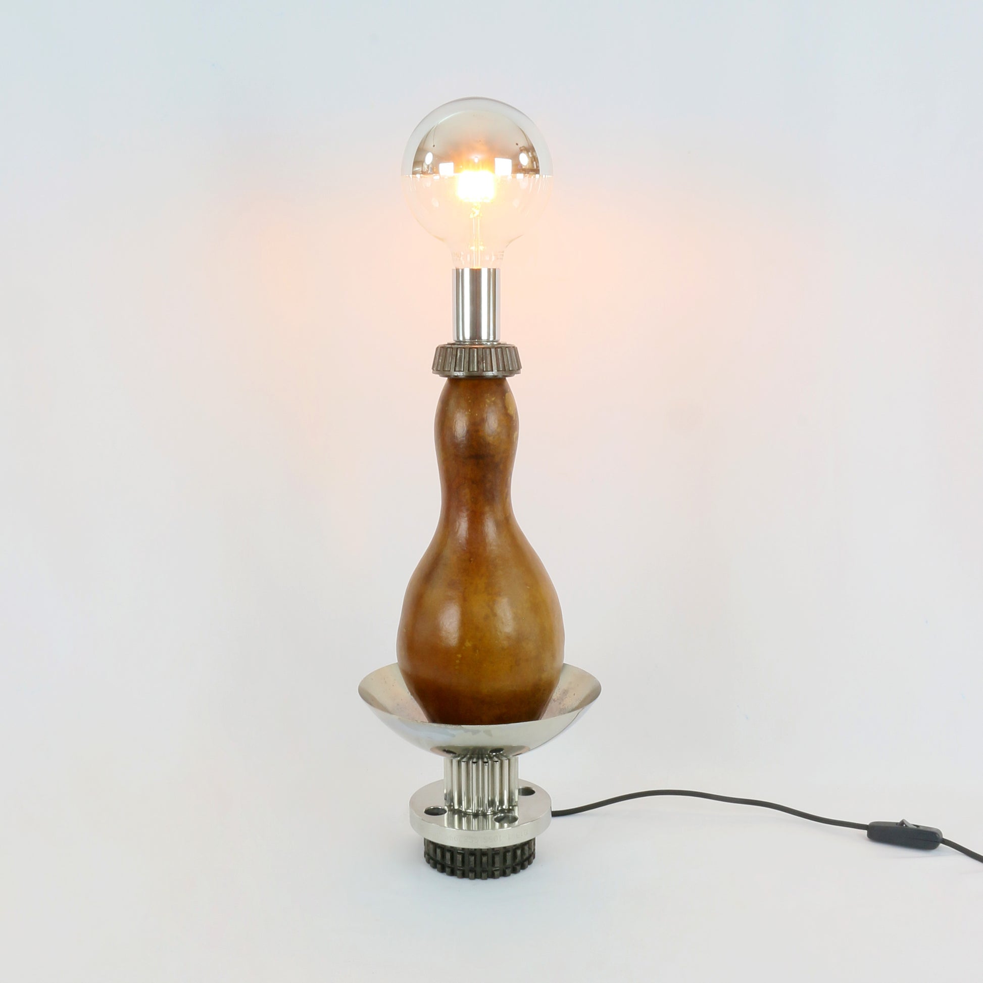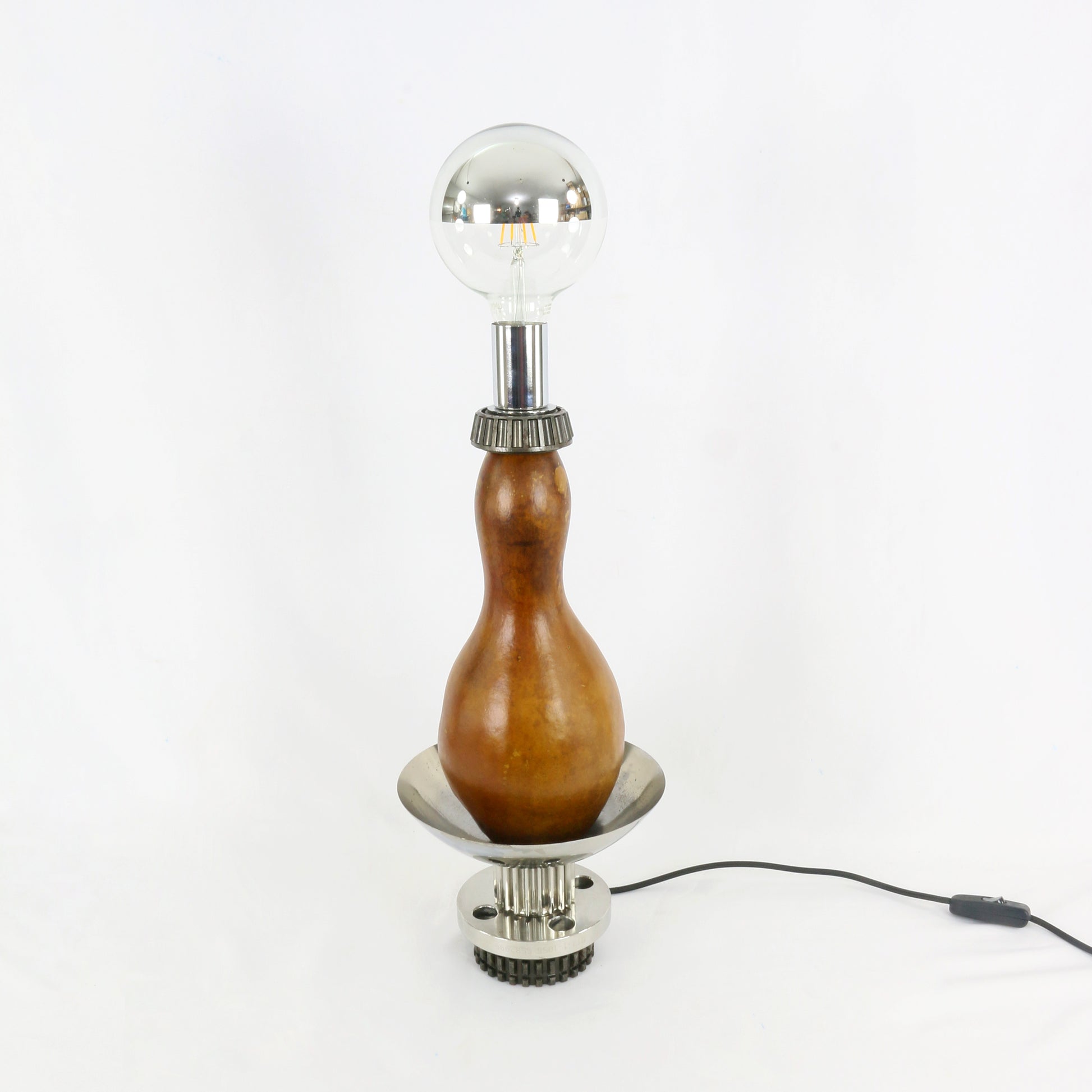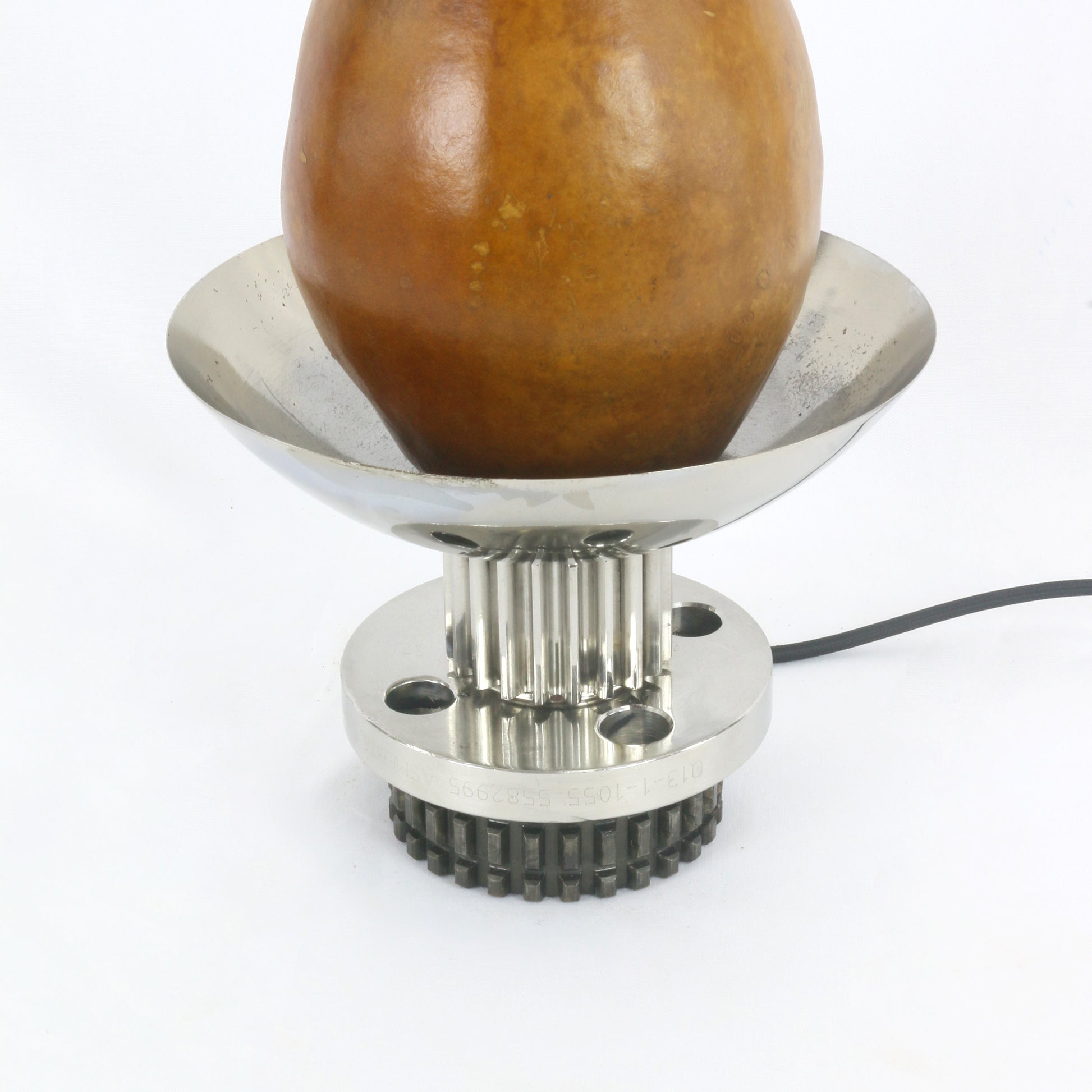 Luminária de mesa, com estrutura em inox, sucata de ferro oxidada e cabaça.