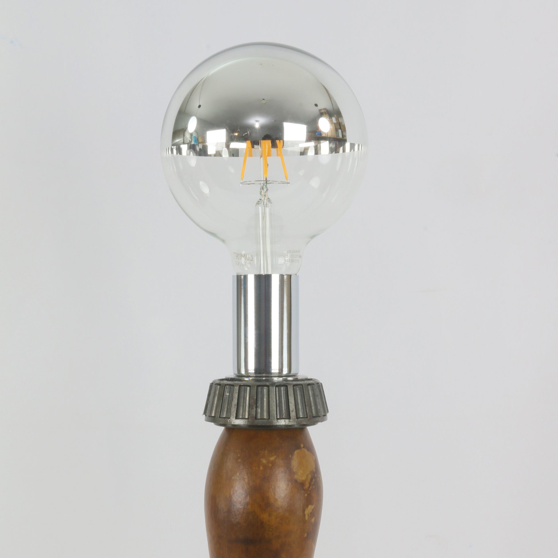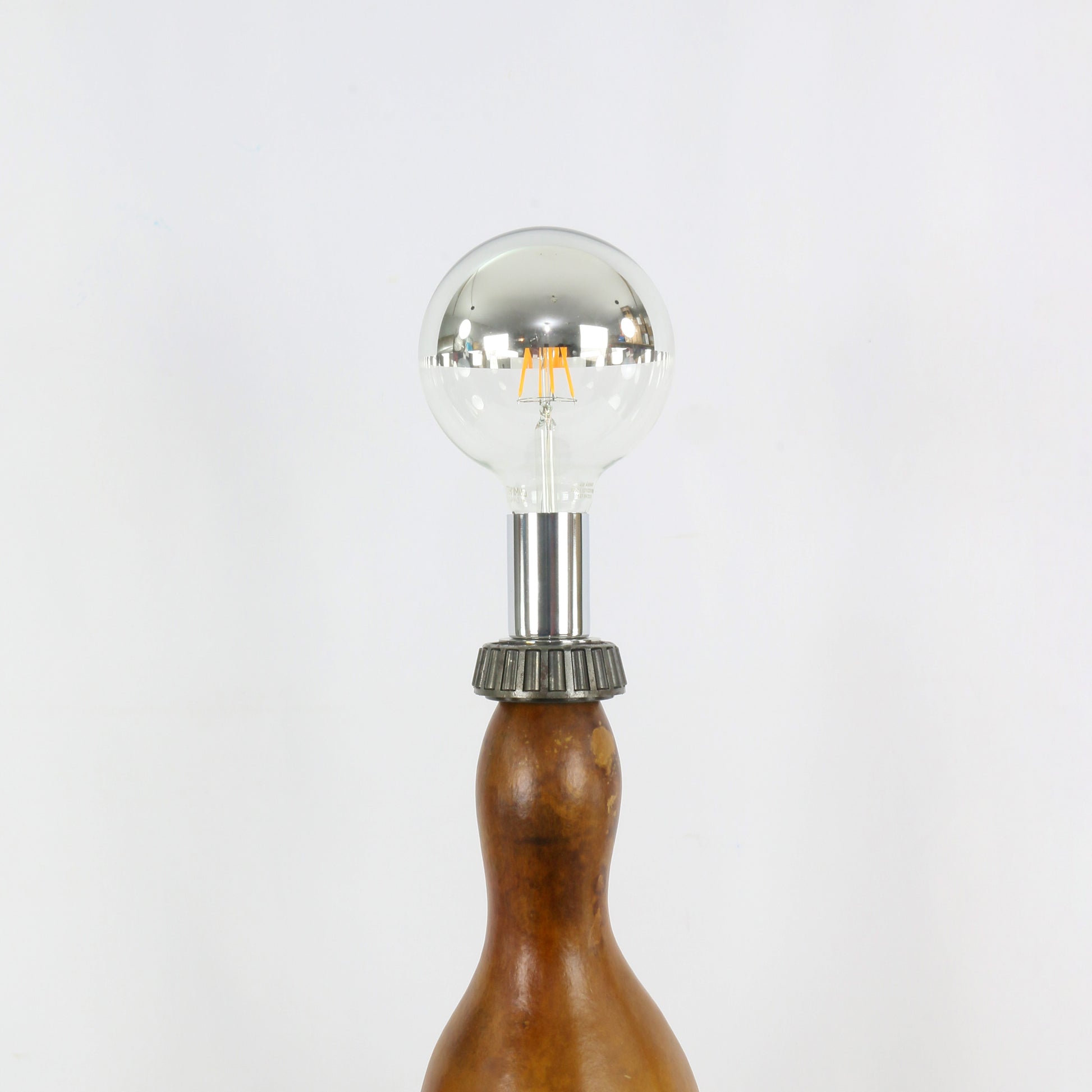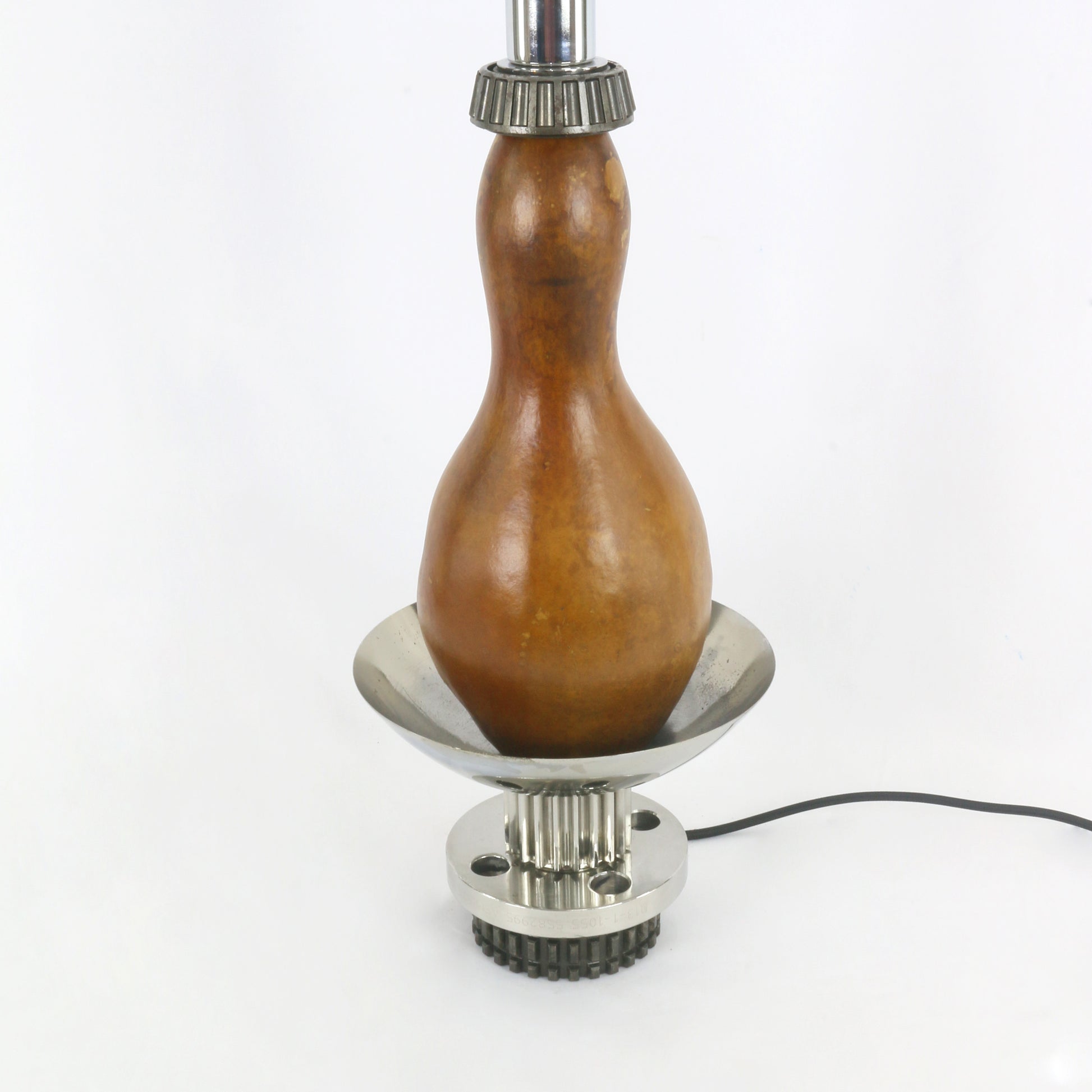 Luminária de mesa, com estrutura em inox, sucata de ferro oxidada e cabaça.