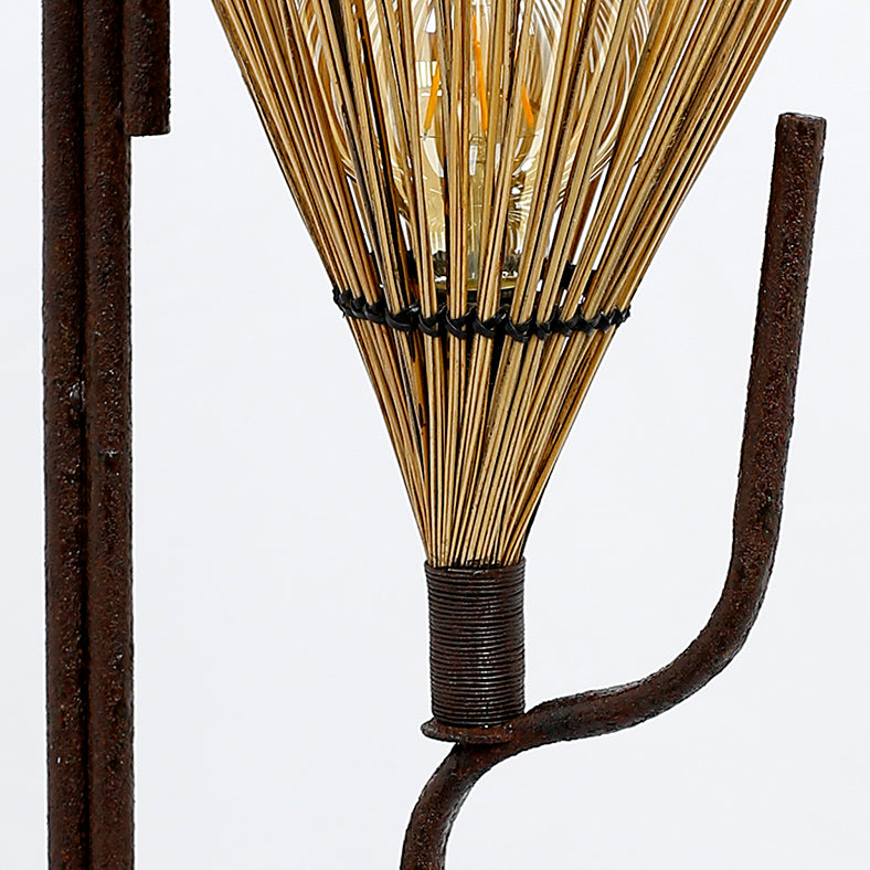 Luminária para ser usada em mesa, com estrutura em sucata em ferro oxidado, com cúpula em fibra de dendê, feita por artesãs da Bahia.