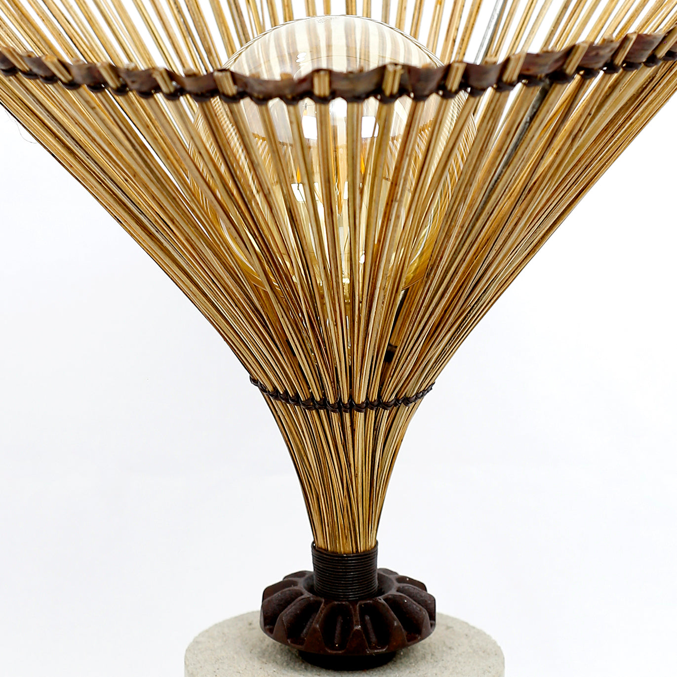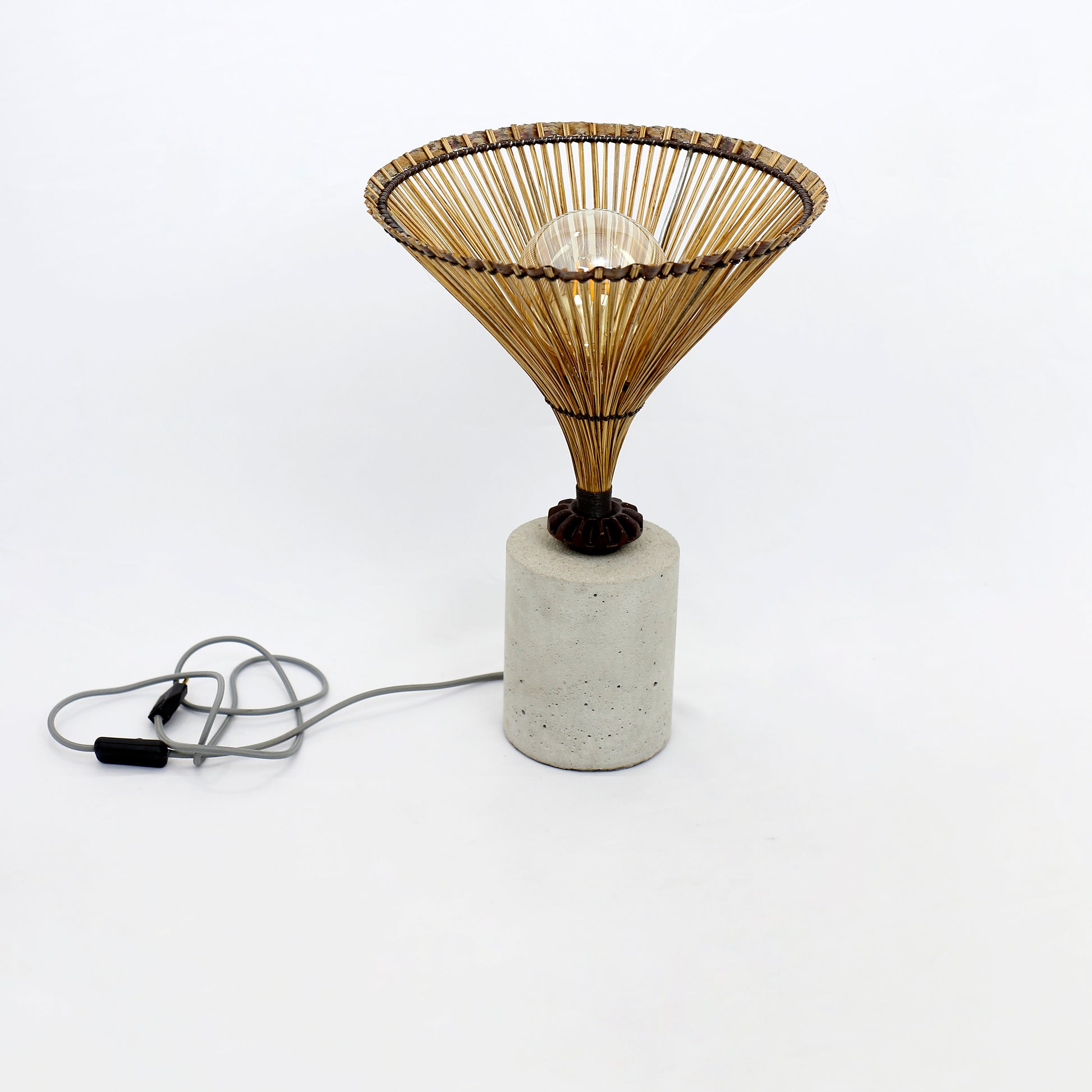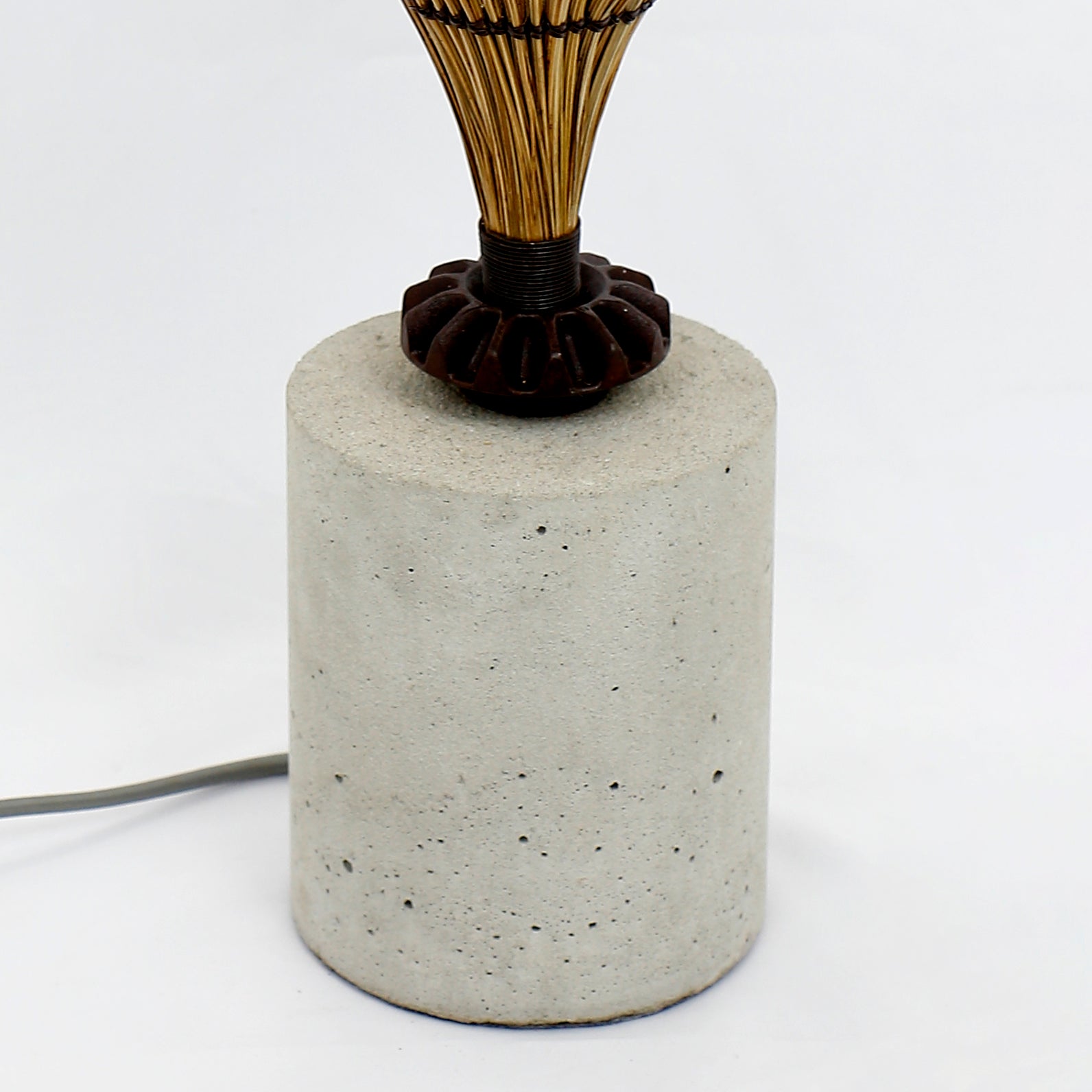 Luminária para ser usada em mesa, com estrutura em concreto e cúpula em fibra de dendê, feita por artesãs do litoral norte da Bahia.