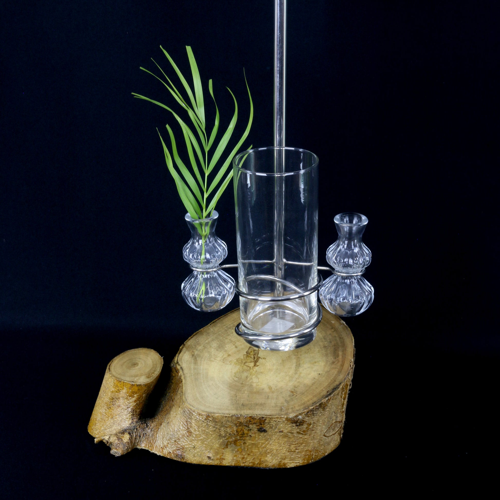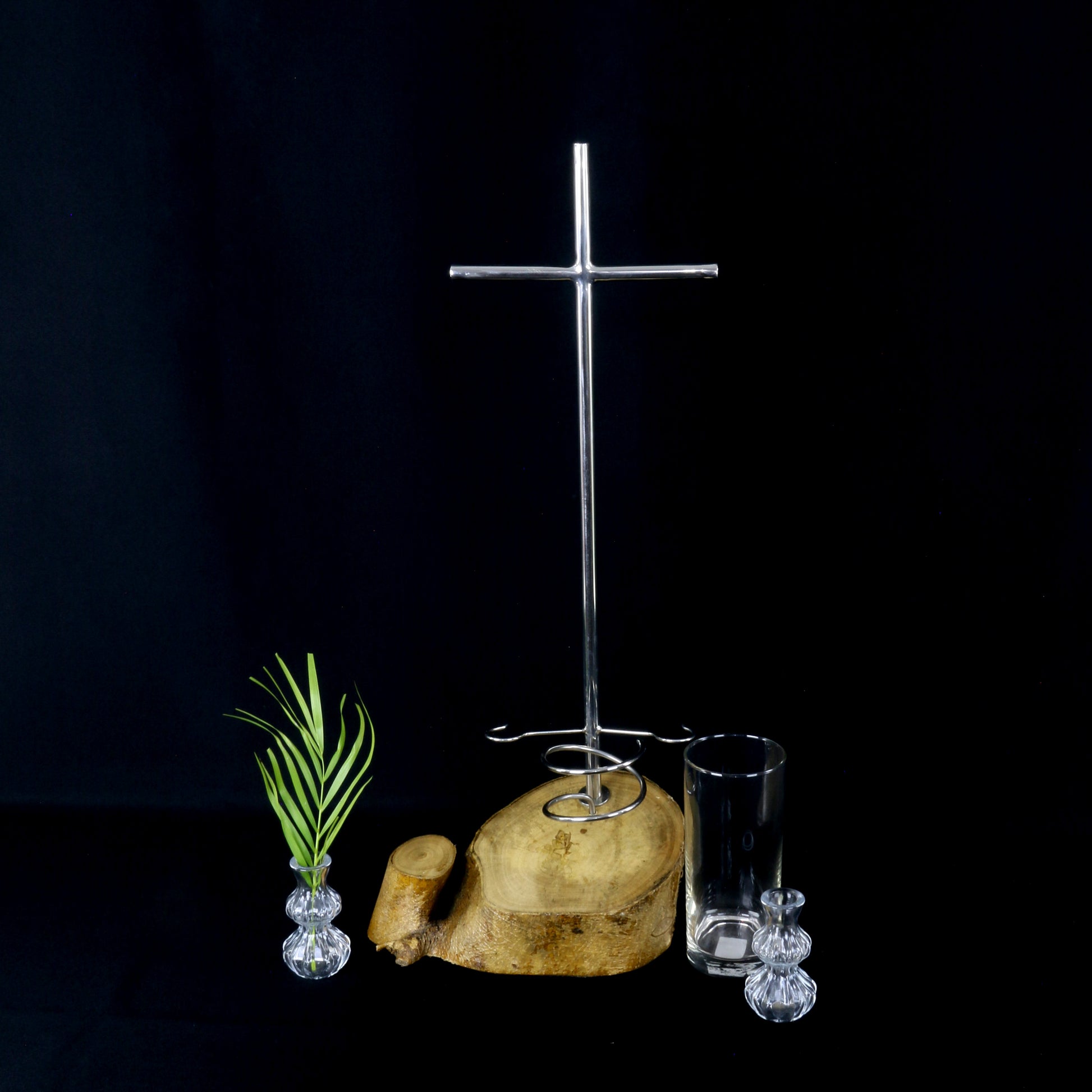 Altar com estrutura em madeira de poda de mangueira, com cruz em inox e suporte em vidro para vela de sete dias, flores e água benta.